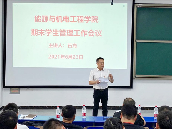 623日,能源与机电工程学院在致远楼102召开2021年上学期期末学生管理工作暨学风建设推进会议,院党总支书记谢常清教授、党总支副书记石海、副院长伍铁斌教授,全体辅导员,2018-2020级各班班长、团支书、学习委员,院学生会全体干部参会,会议由石海主持。
