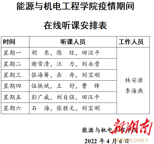 要求全体教职员工以身作则,坚守岗位,落实学院疫情防控的工作要求,了解学生学习情况,做到前台教师讲课,后台辅导员做好学生出勤监督,助力配合教学部门实现线上教学顺利开展。