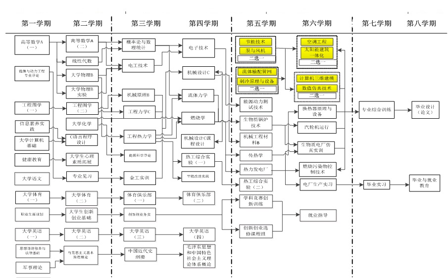 工程热力学、流体力学、传热学、燃烧学、换热器原理与设备、能源动力测试技术、机械工程材料、汽轮机运行、燃烧污染物控制技术、热工综合实验、热力发电厂、生物质锅炉技术等。