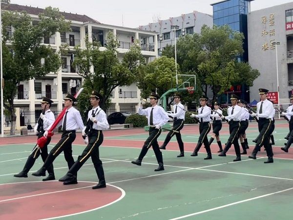 六点四十五分,升旗仪式正式开始。英姿飒爽的国旗护卫队迈着铿锵有力的步伐护送国旗入场。在雄壮的《义勇军进行曲》中,鲜艳的五星红旗冉冉升起,全体师生行注目礼,现场气氛庄严肃穆。