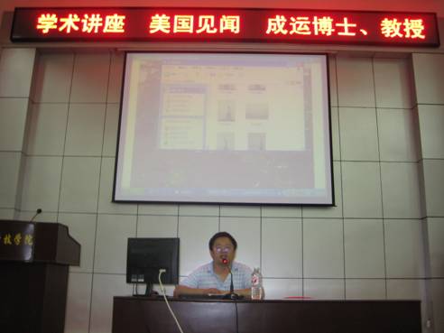 成教授受国家公派,从2010年5月进入美国Temple大学做访问学者一年。首先,他从美国人的衣、食、住、行四个方面展开讲解,并通过大量的城市环境、自然风貌、学习生活等方面的图片,向老师们直观展示了美国的地理、风俗人情以及中西文化的差异。接着,成教授就自己在美国访学的经历,较为详尽地向大家介绍了美国高等教育的特点,并就其与中国高等教育的区别进行了深入的剖析,阐述了美国高等教育在内容和方式上的独特性和启发学生创造性思维的特征。他认为,我们可以结合实际,科学借鉴美国高等教育的成功经验,创新学生培养模式,造就优质的人才。