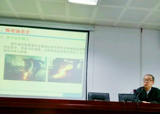 该堂课以日常生活所接触到的机械零部件生产为导引,以“辉煌铸造史”“液态成型技术”以及“液态成型技术展望”为主线,不仅以专业的学术理论讲解了液态成型的理论、铸造技术的发展,而且以贯穿我国千年历史的铸造杰作(如司母戊大方鼎、秦皇铜马车、当阳铁塔等)为典型案例,讲述了金属液态成型技术的重要性,从金属液态成型工艺过程、液态成型技术分类等方面详细讲授了液态成型技术的基本理论、技术特点、应用前景,从传统铸造、特种铸造技术,到当前最先进的金属液态成型技术,特别是白月龙副总经理结合自身的科研及工作成果,对半固体成形技术进行了精彩阐述。最后,以“九化”对未来液态金属成型技术进行了总结,分别是轻量化、高尖化、近终化、精确化、数字化、网络化、洁净化、专业化、高效化。