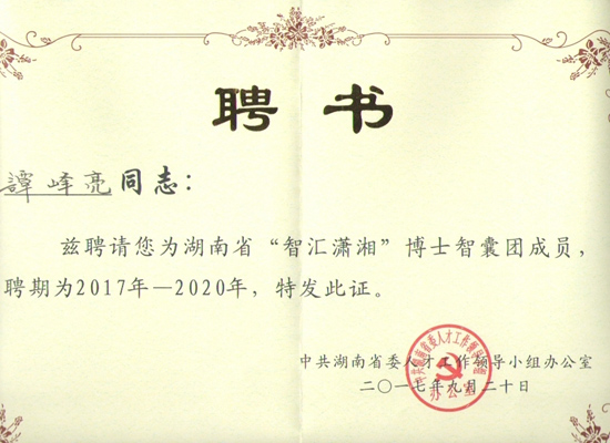 谭峰亮博士被聘为湖南首批“智汇潇湘”博士智囊团成员
