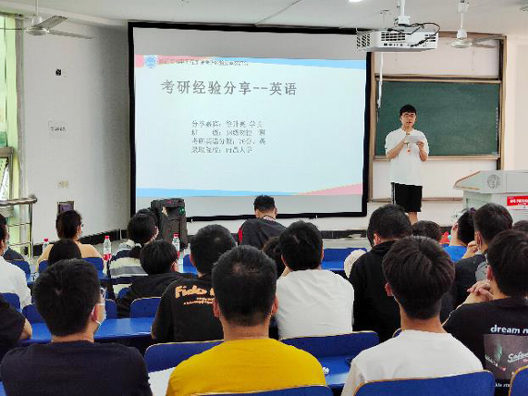 在考研经验交流会专场,考入重庆大学的周泽宇同学、中南大学的罗锃同学、南京航空航天大学的邱恩鹏同学、湘潭大学的邱丹同学和广西大学的何浩宇同学结合自身考研经历,从目标院校选择、方向选取、备考过程、效率提升、心态调整和考研复试注意事项等方面进行了全面阐述,为学弟学妹们勾画了一幅考研全过程画卷。周辉同学、徐升亮同学、郑茂清同学、廖常辉同学和罗玲同学分别以他们的角度各展所长,分别就、数学、英语、专业课、政治的备考复习向学弟学妹们传授了备考经验。最后,自由问答环节,同学们就听了学长学姐经验发言后心中仍然存在的疑惑大胆提问,学长学姐们耐心细致地为同学们答疑解惑,使同学们对考研有了更具体更清晰的认识,更加坚定了考研必胜的信心。