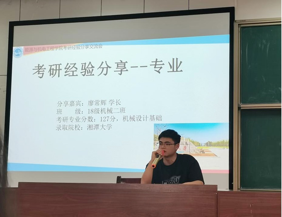为进一步帮助2019级学生更好地了解考研事宜,解决学生备考期间遇到的困惑,增强学生考研信心,坚定努力拼搏的信念,2022年5月初,能源与机电工程学院考研经验交流会在致远楼320和同德楼601教室教室举行。院长胡东、副院长伍铁斌、考研班班主任廖湘平博士、辅导员戴建利、2019级全体考研学子、2018级已考取研究生优秀代表参会。