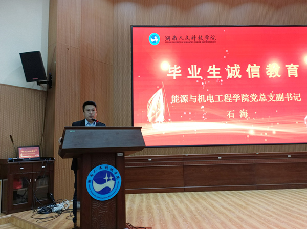 5月24日,能源与机电工程学院在匠成楼报告厅召开2022届毕业生征兵动员大会暨毕业生诚信教育。党总支书记谢常清、院长胡东、党总支副书记石海、副院长伍铁斌、毕业班班主任、全体辅导员、2022届毕业生及主要学生干部参加会议。