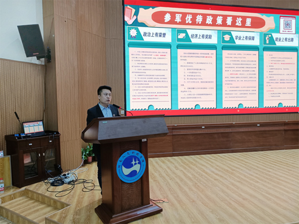石海首先对学院2022年大学生应征入伍情况进行了详细介绍,并从高校毕业生就业形势和入伍优待政策等方面分析了当前征兵工作面临的形势,为学生们解读了今年征兵的条件和相关政策,尤其是学生最为关心的大学生应征入伍可享有的优先考学提拔、补偿学费和代偿国家助学贷款、退役后享受就学就业优惠等优抚政策。鼓励大学生要敢于有梦、敢于追梦、敢于圆梦,让青春在军营的历练中、在为祖国的奉献中闪光。号召同学们积极应征入伍,到部队去锻炼自己,成就自己。此次宣传活动极大的增强了学生参军入伍的热情,强化了同学们保家卫国的责任感和使命感,也为太阳成官网大学生征兵活动的顺利开展奠定了坚实的基础。