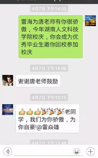 4月7日,班主任唐良凡老师在班级微信群里为雷海为获得冠军表示祝贺,说他不仅为自己争光,也为母校争光,并邀请他回校参加校庆,给学弟学妹们做学习榜样!