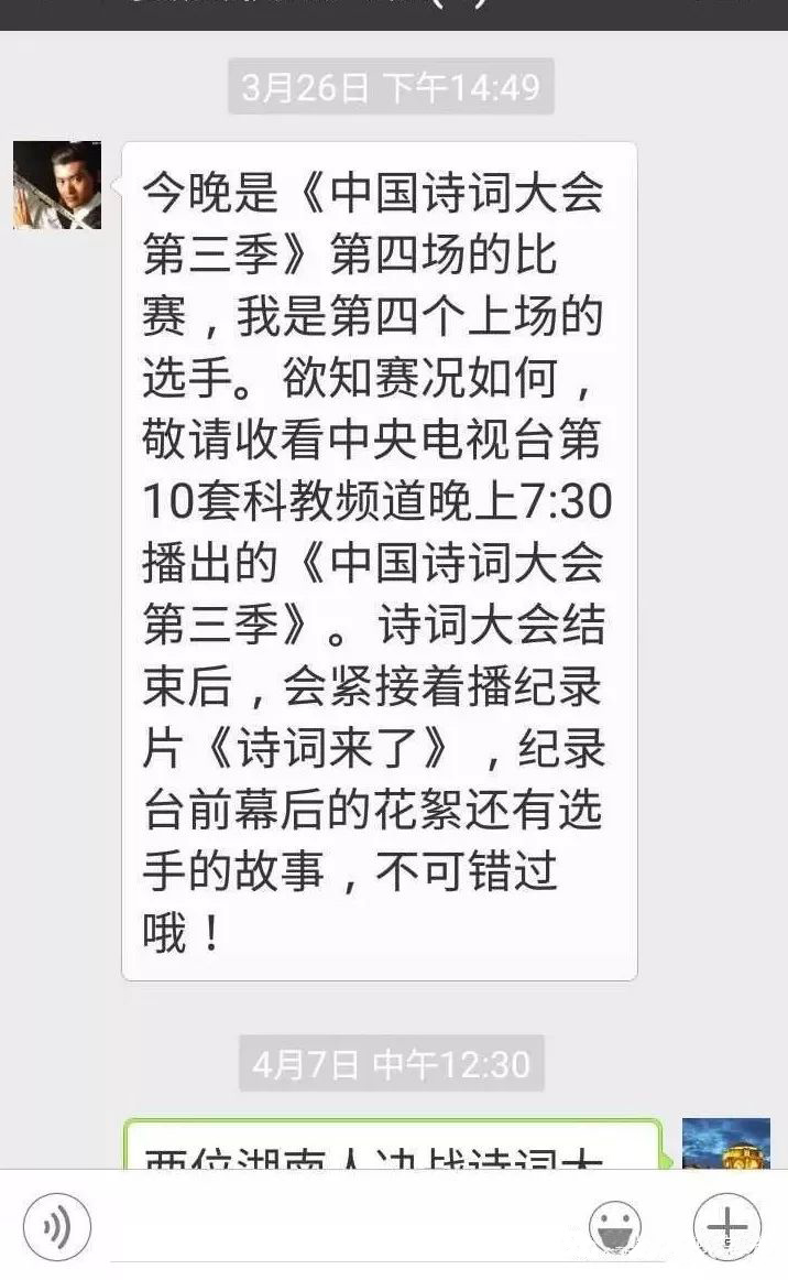 3月26日,雷海为在机电六班班群发来信息,说自己参加了《中国诗词大会第三季》第四场的比赛,第四个上场。