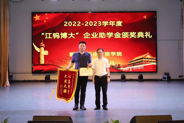 石海宣读了2022-2023学年“江钨博大”企业助学金获奖名单,共30名品学兼优的贫困学生获得资助,共计发放助学金3万元整。马遥、李军林、胡东先后为30位获资助学生颁奖。获资助学生代表张景滨发言表达了对爱心企业和学院的感恩之情,并表示会更加严格要求自己、努力学习、勇于实践,以奋发有为的精神面貌,以新的姿态迎接新的挑战步。随后,马遥代表企业对获资助同学表示祝贺,并表示将继续支持学院的教育事业。最后,李军林代表学校对慷慨捐资助学的株洲江钨博大硬面材料有限公司致以衷心的感谢,并希望同学们利用好学校学院提供的良好学习环境,不断提升自身综合能力,练就过硬本领,坚定理想信念,听党话跟党走,做中华民族伟大复兴道路上的合格建设者和接班人。