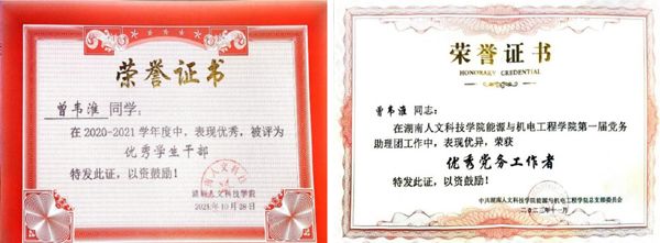 “士不可以不弘毅,任重而道远”,入学至今,曾韦淮的学业成绩一直保持在专业前列,多次荣获奖学金。研创赛一手抓,他积极参加各类创新创业类赛事,并斩获佳绩。他始终铭记习近平总书记的嘱托:“广大青年要肩负历史使命,坚定前进信心,立大志、明大德、成大才、担大任,努力成为堪当民族复兴重任的时代新人,让青春在为祖国、为民族、为人民、为人类的不懈奋斗中绽放绚丽之花。”他说:责任亦如生命可以轻如鸿毛也可重于泰山,作为学生、作为党员、作为中华儿女,广大青年要时时思考如何发展自己、提升本领,成为一个勇挑重担、堪当大任的新时代中国青年。