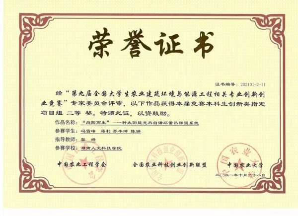 2021年获“第九届全国大学生农业建筑环境与能源相关专业新创业竞赛”二等奖