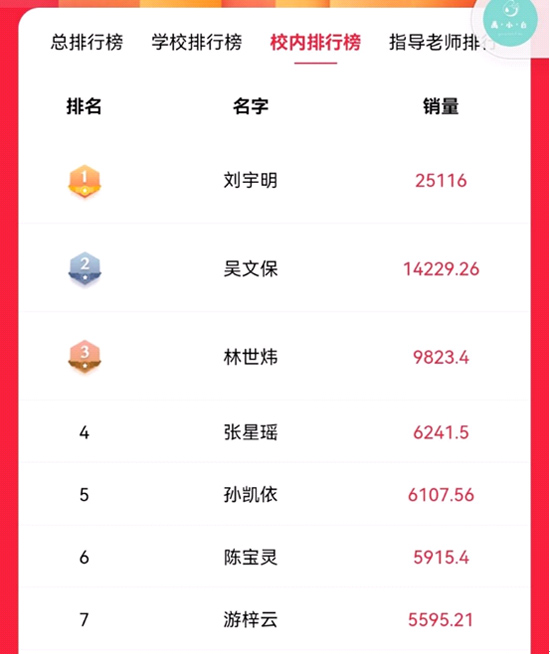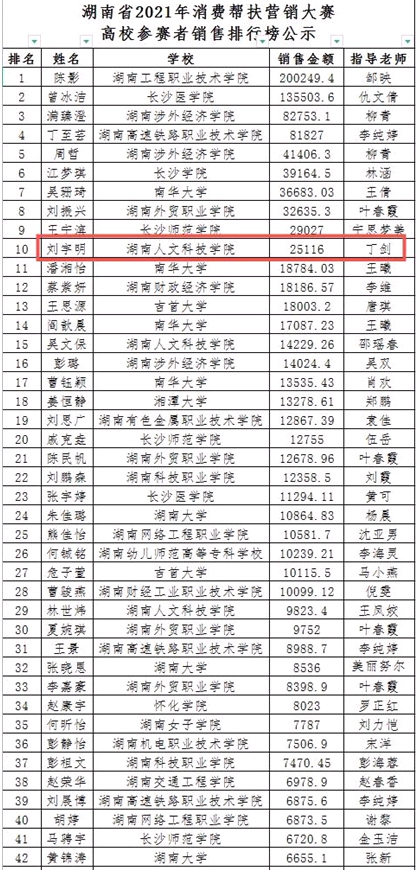 近日,湖南省2021年消费帮扶营销大赛高校参赛者排行榜公布,太阳成官网学子刘宇明,经过激烈的比拼,最终在数千名参赛选手中脱颖而出,以25116元的销售金额,勇夺本届大赛季军(全省第10名),展现了太阳成官网学子高超的营销技能水平和优良素质。