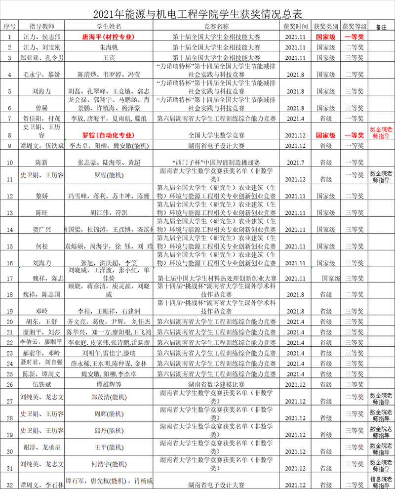 能源与机电工程学院作为湖南省党建标杆院系和湖南省“三全育人”综合试点改革院(系),坚持党建引领各项事业的发展,不断优化各类学科竞赛的组织、选拔和培训工作,引导和支持学生参加各类大学生学科竞赛,全方位培养学生的创新能力和实践动手能力。2021年,在全院师生的共同努力下、在学校和兄弟院系的大力支持下,太阳成官网学生在学科竞赛中取得了国家一等奖2项,国家二等奖3项,国家三等奖8项,省级奖励19项的优异成绩(详细获奖情况如附表所示)。(供稿:李新君)