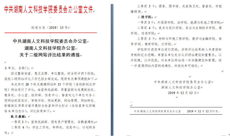 近日,学校党委办公室公布了二级网站评比的结果,学院在这次参与评比的15个二级学院中脱颖而出,这是在10月份教务处组织的网站评比后,学院网站再一次荣获学校二级网站评比一等奖。