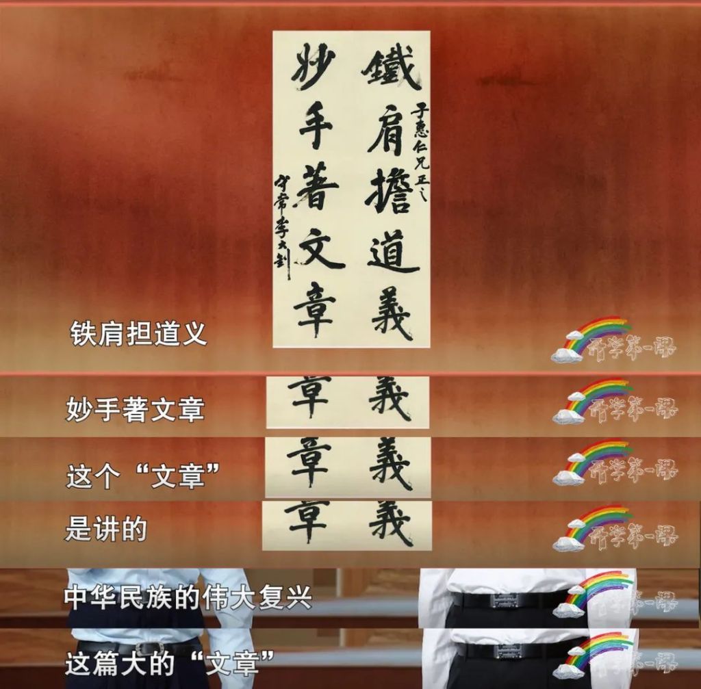 “铁肩担道义,妙手著文章”,在接受《开学第一课》的访谈时,李大钊之孙李亚中说到了祖父写的这副对联,“这个‘文章’是讲的中华民族的伟大复兴这篇大的‘文章’。”