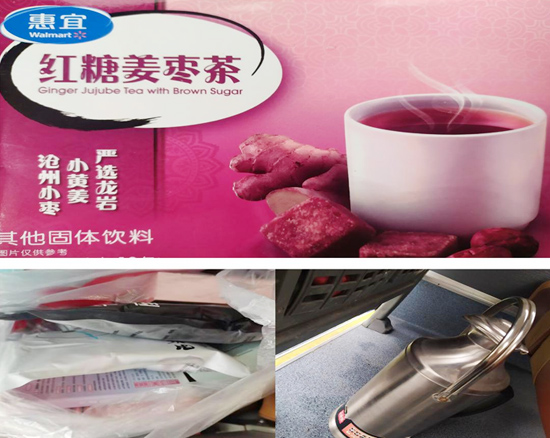 (送考车配备的姜茶、暖宝宝、食品和热水)