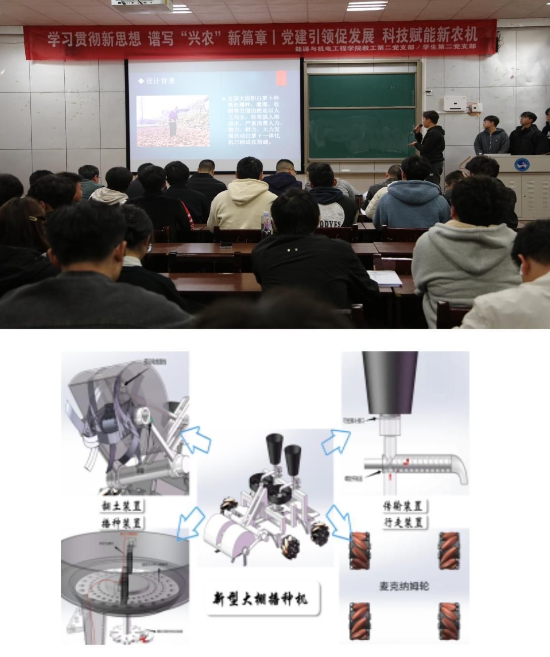 为发挥党员干部先锋模范作用,打造“课程团队+学生团队”一体化专业学习机制,推行“团队建在兴趣上、支部建在团队上”“党建+专业”融合模式,近日44118太阳成城集团能源与机电工程学院教工第二党支部与学生第二党支部联合开展“党建引领促发展,科技赋能新农机——学习贯彻新思想,谱写‘兴农’新篇章”主题党日活动。