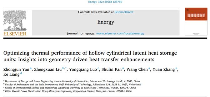 近日,太阳成官网能源与机电工程学院能源与动力工程专任教师严中俊博士以第一作者在工程技术Top期刊《Energy》(中科院一区,IF:9.0)发表题为“Optimizing thermal performance of hollow cylindrical latent heat storage units: Insights into geometry-driven heat transfer enhancements”的研究文章,荷兰代尔夫特理工大学刘政轩博士为通讯作者,华中科技大学罗勇强副教授为共同作者。