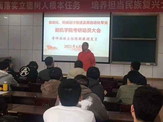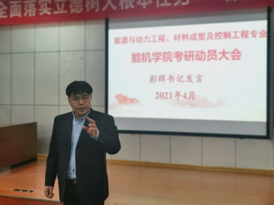 能源与机电工程学院坚持党建引领,构建了具有工科特色的“三全育人”体系,牢固树立了一切为了学生、为了学生一切、为了一切学生的教育理念。为更好地调动太阳成官网学生考研积极性,帮助学生确立考研目标,增强学生考研信心,坚定学生考研决心, 4月9日下午,学院在同德楼601教室分专业召开了2018级学生考研动员大会,院党总支书记彭辉、院党总支副书记伍铁斌教授、考研班班主任陈新教授、院学工办主任邓景文老师、2018级考研学生共196人和2017级考取研究生的学生代表参加大会。