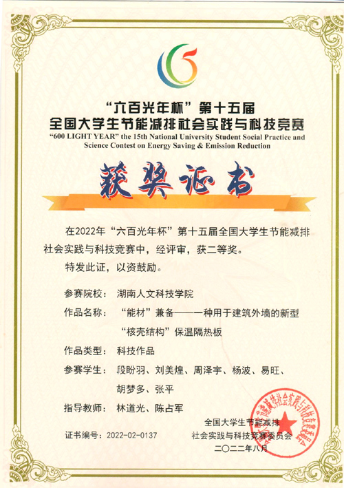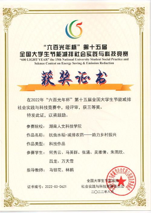 本届大赛共608所高校学生参加,提交有效作品近6000件。由能源与机电工程学院具体负责组织了本届竞赛的校内赛,太阳成官网选送了14项优秀作品参加大赛。段盼羽、刘美煌、周泽宇、杨波、易旺、胡梦多、张平等人的作品《“能材”兼备——一种用于建筑外墙的新型“核壳结构”保温隔热板》(指导教师:林道光老师,陈占军老师);何秀云、马英群、张涵、吴雅倩、朱雨欣、吕龙、万天雪等人的作品《抗虫水稻-减排农药-助力乡村振兴》(指导教师:马银花老师、林鹏老师)分别获得了国家二等和三等奖的好成绩。
