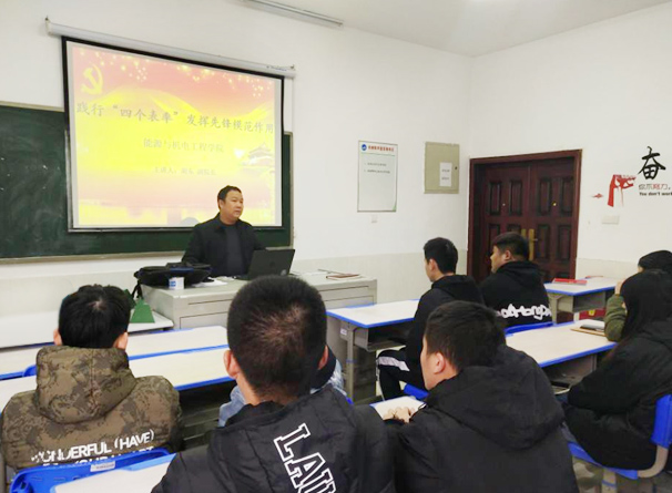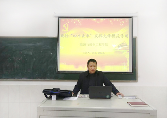 2020年12月19日,能源与机电工程学院副院长胡东博士在同心楼302为学生第二党支部全体学生党员上党课,党课的主题是“践行‘四个表率’,发挥先锋模范作用”。