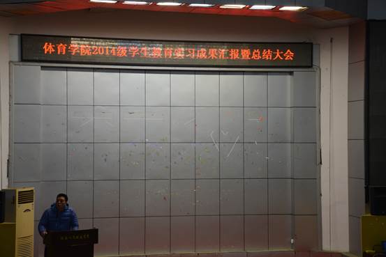 值此辞旧迎新之际,2018年1月2日下午2时30分,体育学院2014级学生教育实习成果汇报及总结大会在学校匠成楼报告厅胜利召开,学校教务处副处长邓敏超、学校教学督导团成员李夫泽、陈征南教授及体育学院院长刘玉江、书记蒋毅,副院长曾黎、退休教师蔡开明以及杨赳赳、龙宋军、周惠新等老师参加了总结大会并担任评委。为了将经验介绍给大家,2015级全体同学和2014级各实习队成员认真听取了会议内容。体育学院2014级全体带队教师、2015级各班班主任全程参与。