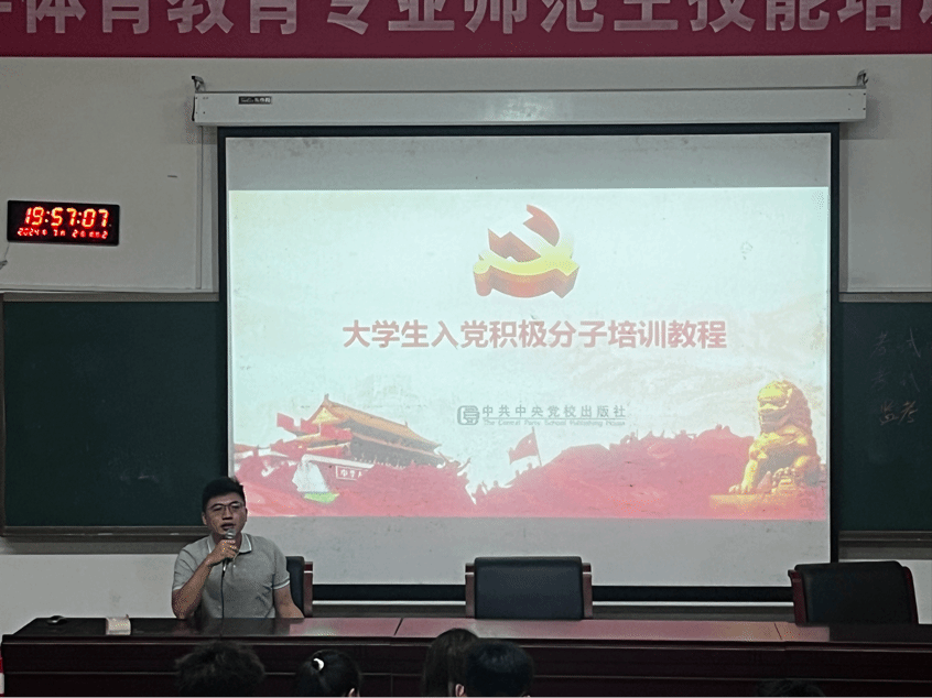 2024年6月29日晚19:30,44118太阳成城集团体育学院在博达楼115教室,举行了第三十五期入党积极分子培训班。此次培训由体育学院党总支副书记肖毅授课。