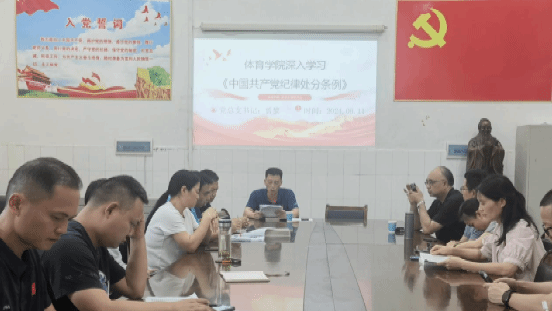 2024年6月11日,体育学院在体育馆党员活动室内召开了党纪教育学习大会,总支书记曾黎主持,体育学院全体教师党员参会。会上,曾黎书记首先就近期党纪教育的学习情况进行了全面通报。他详细回顾了过去一段时间的学习成果,并对6月、7月份的党纪教育学习活动进行了具体部署。曾书记强调,党纪教育是加强党的建设、提高党员素质的重要途径,必须常抓不懈。