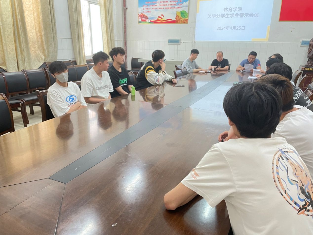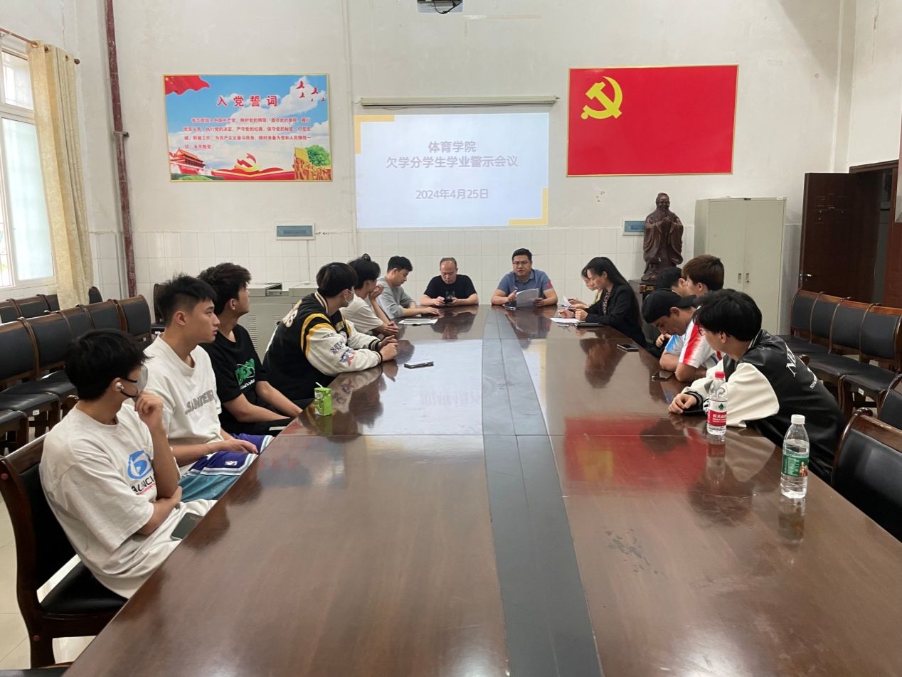 为进一步加强体育学院学风建设,落实体育学院学业预警制度,及时跟进掌握学业警示学生的情况,做好对学习困难学生的教育、引导工作,4月25日下午,在体育馆105会议室召开欠学分学生学业警示会议。副院长周惠新、副书记谢嘉主持会议,学工办主任闵婷、各年级辅导员参加了此次会议。