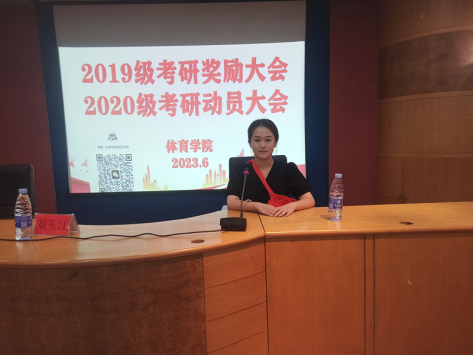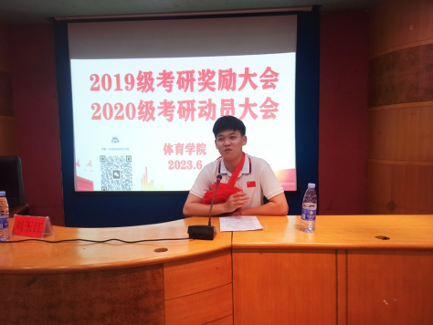 2023年6月6日下午4时,为树立考研新风,进一步做好2024年考研工作,体育学院在养根楼报告厅举行2019级学生考研奖励大会暨2020级学生考研动员大会。院长刘玉江、副院长周惠新、体育教育专业负责人陈勤、运动训练专业负责人周阳、2019级班主任彭玉宇、杨岭等出席活动。2019级考研录取全体学生,2020级部分考研学生参会。会议由体育学院副院长周惠新主持,一共四个环节。