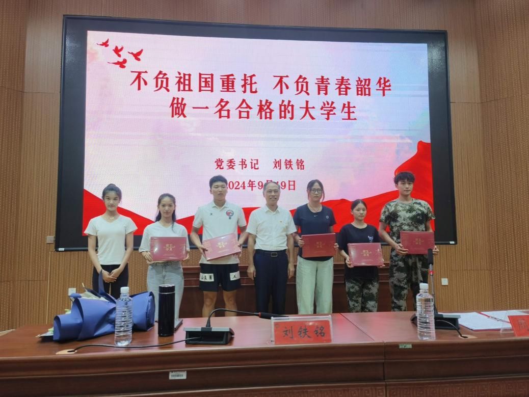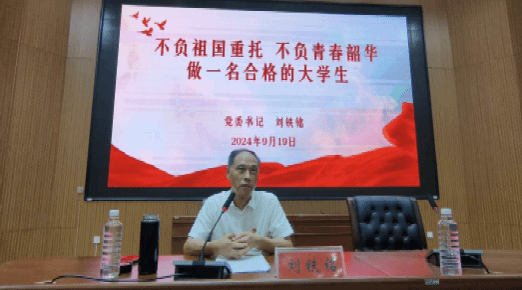 9月19日晚,学校党委书记刘铁铭教授在匠成楼报告厅为体育学院2024级全体新生带来了一场主题为“不负祖国重托,不负青春韶华,做一名合格的大学生”的开学第一课。讲座由体育学院院长周惠新主持,体育学院全体院领导、辅导员、班主任老师及2024级新生们一起聆听讲座。