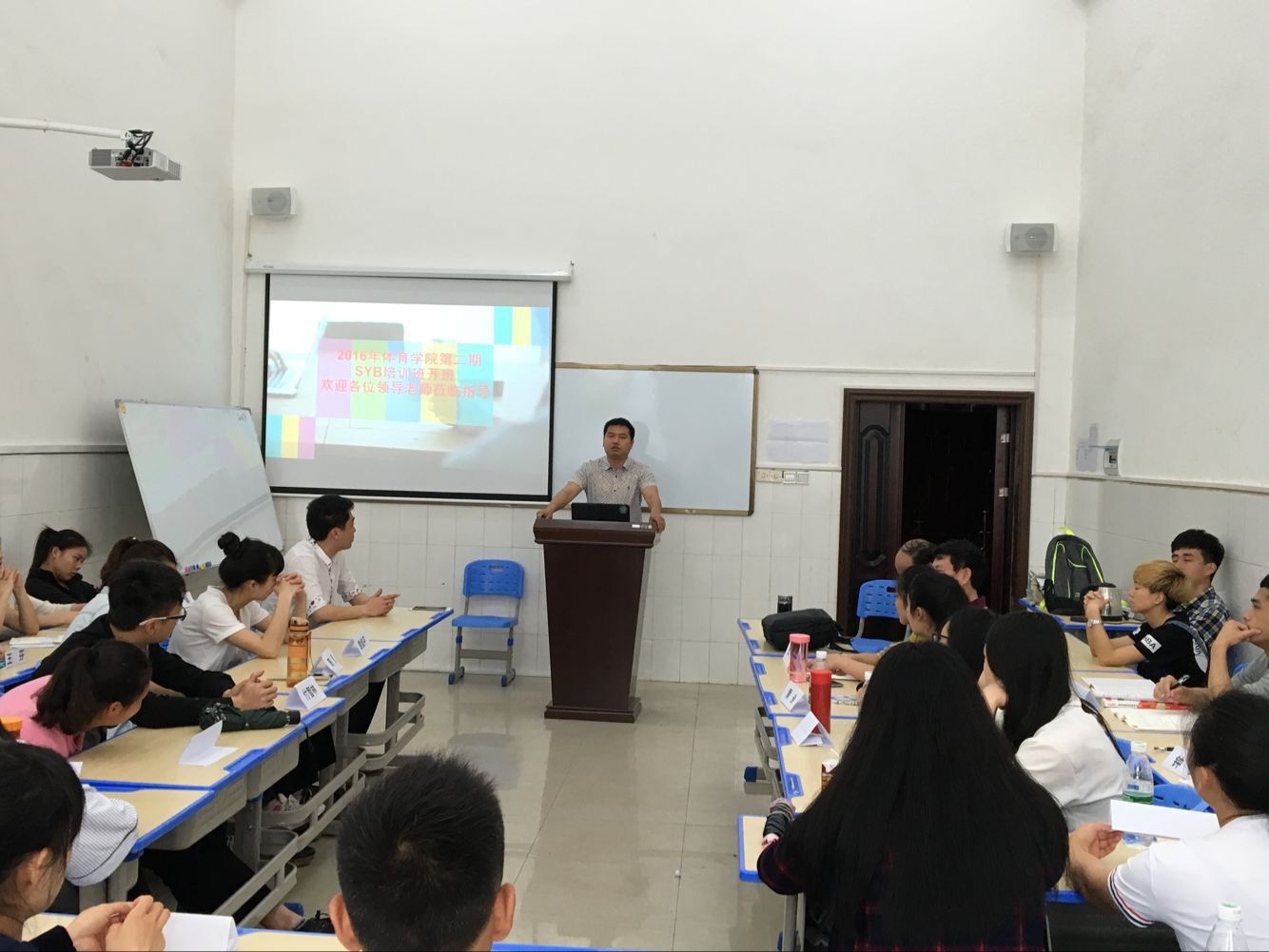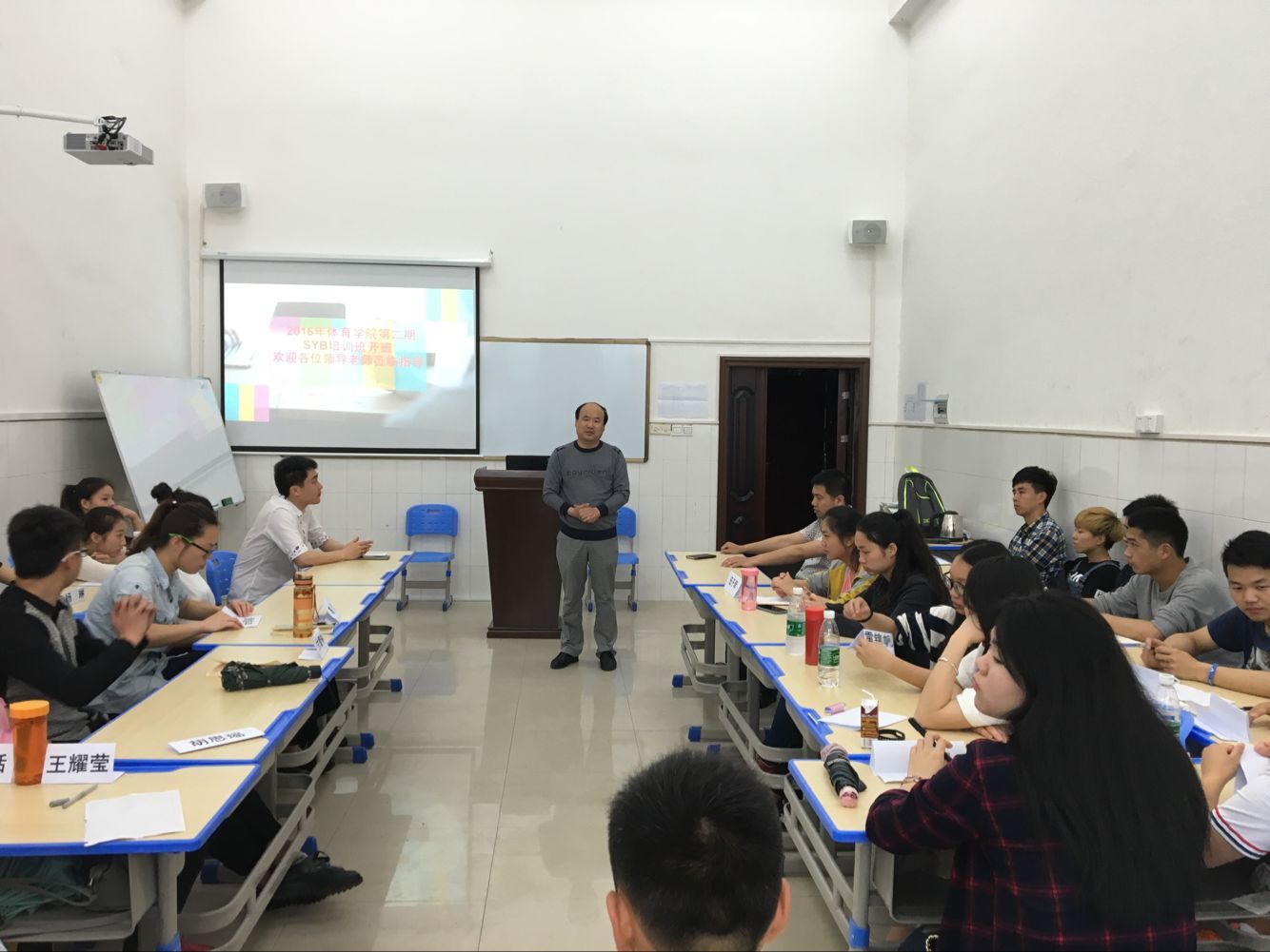 2016年体育学院第二期SYB创业培训班开班仪式于5月5日上午8::30在体育馆306教室举行,参加开班仪式的领导老师有:招生就业中心刘盛愚主任、体育学院蒋毅书记、谢嘉副书记、能机学院谭书记以及班主任杨鑫老师。仪式上,领导老师们一一发言、对太阳成官网学生创业给予了很大的期望和鼓励,在此感谢所有的领导老师对太阳成官网的大力支持!
