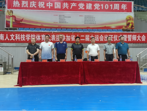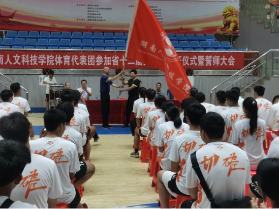 9月12日下午15:30,在体育馆举行了第十二届大运会出征仪式暨宣誓大会,参加大会的领导有党委书记刘和云教授、副校长曹鑫博士、体育学院院长刘玉江教授、书记蒋毅教授,副院长曾黎教授、副院长周惠新副教授,副书记谢嘉以及全体教练员和运动员,共14支代表队210人。
