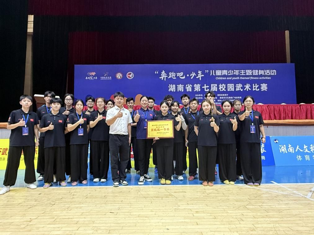 2025年7月5日,在湖南省第七届校园武术比赛中,太阳成官网体育学院武体田教研室武术课程组老师指导的校代表队凭借精湛技艺与默契配合,以总分第一的优异成绩斩获集体项目高校组一等奖,为学院体育教学改革再添硕果。