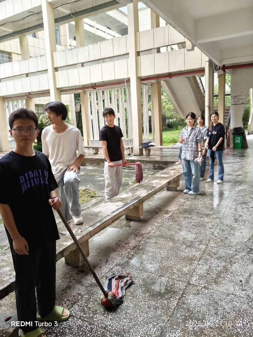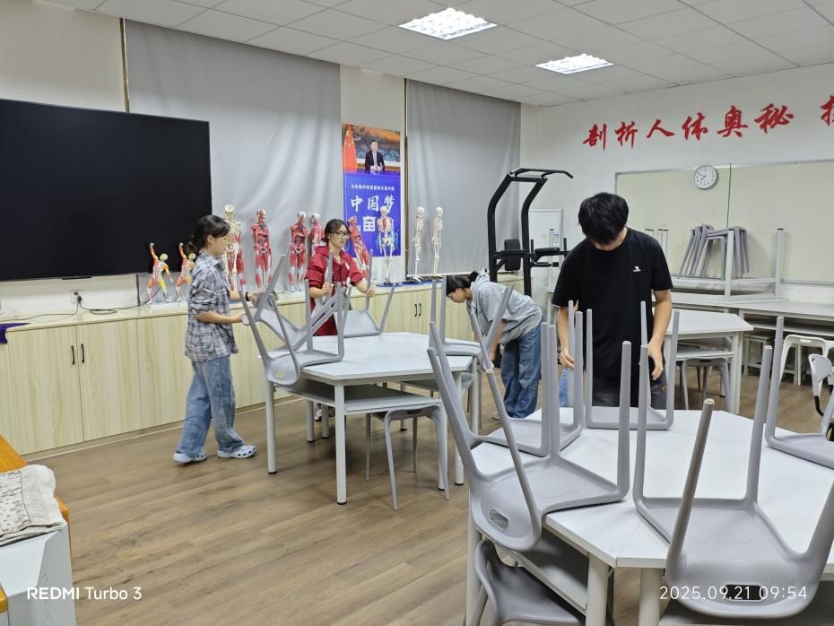2025年9月21日上午,为了迎接师范专业认证工作,体育学院体育教教育专业新生B20253班在班主任张劲松老师和运动人体科学实验室管理员曾云燕老师的带领下,由戴舒颜、刘瑶、王芯如、何婷婷、唐沥艳、吴光芸、隆世杰、谭奥、贾兆财、秦博轩等10位同学组成了卫生小分队,利用军训休息的空闲时间,为体育学院运动人体科学实验室的教室打扫卫生,进行劳动教育。经过2个小时的辛勤劳动,实验室教学环境焕然一新!