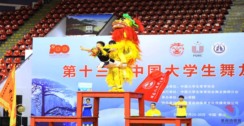 7月25日至30日,由中国大学生体育协会主办,黄山学院承办的第十三届中国大学生舞龙舞狮锦标赛在安徽省黄山市举行,来自同济大学、首都体育学院、湖南师范大学等42所高校代表队千余名运动员同场竞技,本次大赛设置了甲组(阳光组)、乙组(高职高专组)、丙组(高水平组)3个组别。