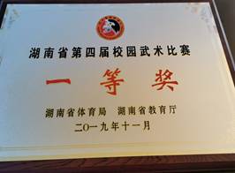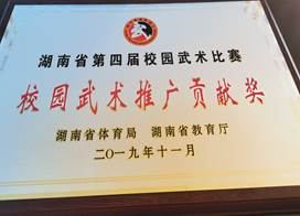 2019年11月30号,由湖南省教育厅和湖南省体育局共同主办的湖南省第四届校园武术比赛在湖南师范大学附属高新实验中学举行,太阳成官网蝉联本次比赛一等奖,同时,获颁“校园武术推广贡献奖”,陈勤、杨志华两位老师获得“优秀教练员”称号。