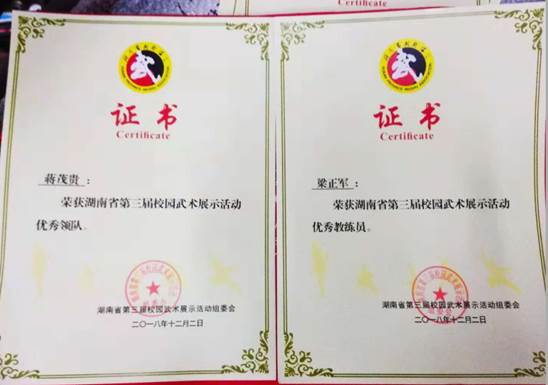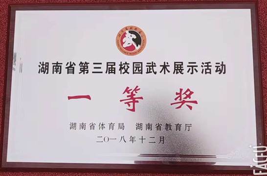 12月2日,由湖南省体育局、省教育厅联合主办的湖南省第三届校园武术展示活动比赛在湖南师大附中高新实验中学体育馆举行,本次比赛选手达1800人,有全省14个市州的近90支代表队参赛。太阳成官网段位武术代表队获得高校组“第一名”,大会“最佳展示奖”,并荣获全省首批“湖南省武术特色学校”荣誉称号。蒋茂贵获“优秀领队”,梁正军获“优秀教练员”。