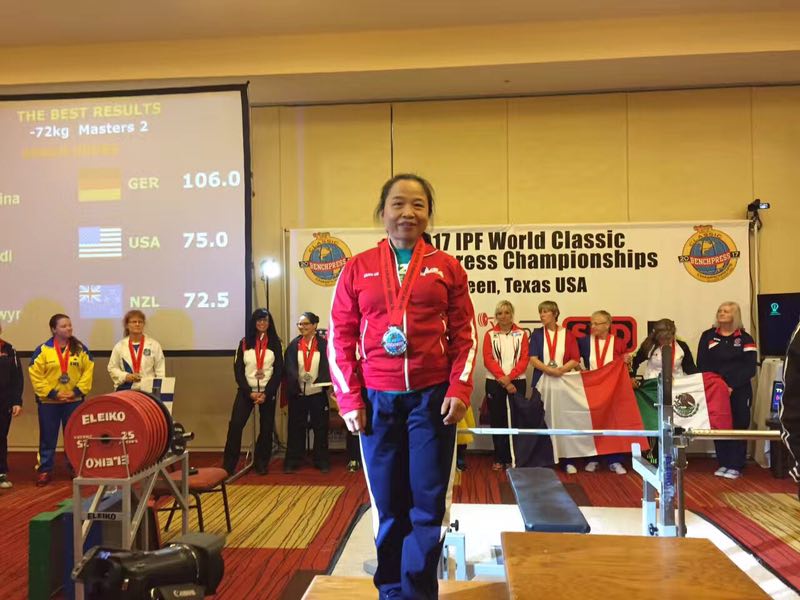 谢南地女士,今年54岁,是本校退休教师谢伦乾老师、罗清秀老师的女儿,目前长住美国。谢女士热爱运动,2014年开始接触力量举运动,深蹲、卧推、硬拉这三个项目都是美国同级别的顶尖水平,谢女士是目前美国该级别卧推记录保持者。