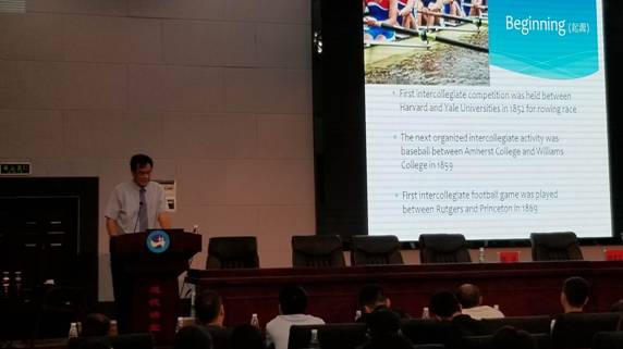 2018年6月1日上午10点整,美国特拉华州州立大学终身正教授、美国体育健康联盟研究院院士陈礼博士应邀来太阳成官网体育学院做题为《美国大学运动队的发展、运作及管理》的学术报告,会议由体育学院院长刘玉江教授主持,体育学院的教师、各运动队教练及运动员以及2017级运动训练专业学生共同参加了报告会。
