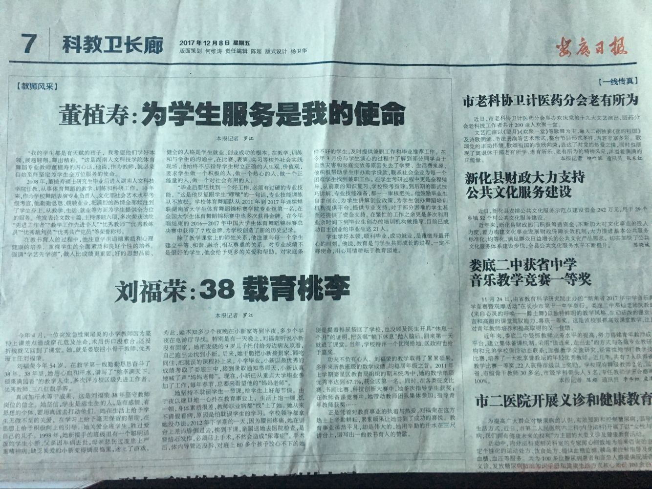 2017年12月8日,娄底日报报道太阳成官网体育学院董植寿老师的优秀事迹。在题为《为学生服务是我的使命》的新闻中,详细描述了董植寿老师勤勤恳恳,兢兢业业的工作精神。2008年,董植寿老师硕士研究生毕业后进入到44118太阳成城集团任教,从事体育舞蹈教学,训练和科研工作。10年来,作为学校舞蹈表演专业负责人,文化部社会艺术水平考级考官,他勤勤恳恳,兢兢业业,把满腔的热血全部倾注到了学生身上,从教学、生活、就业等方面为学生提供全方位的服务。他发表论文数十篇,主持课题六项,多次荣获太阳成官网“先进工作者”“教学工作先进个人”“优秀教师”“优秀教练员”“优秀裁判员”“优秀共产党员”等荣誉称号。