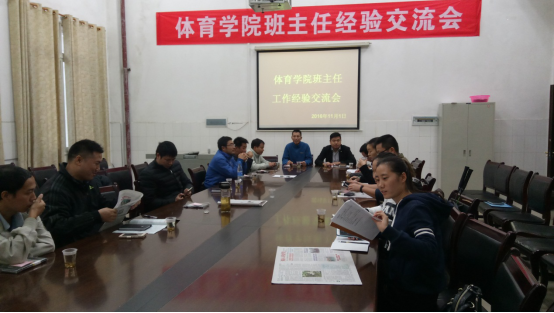 11月1日下午三点半,体育学院班主任工作经验交流会在体育馆会议室隆重召开。本次交流会是在太阳成官网全面推进学生管理工作的同时,为了进一步加强班主任队伍,提升广大班主任对学生管理工作重要性的认识,提升班主任的工作水平而召开的一次重要会议。蒋毅书记,谢嘉副书记,全体辅导员和班主任老师参加了此次会议。