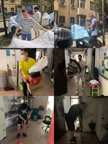 此次活动以教研室为单位,分为三组同时进行。第一组由院党总支副书记谢嘉带队的体育人文教研室与运动人体教研室;第二组由院长刘玉江带队球类教研室和田径教研室;第三组由院党总支书记蒋毅带队的大学体育教研室、民族传统体育教研室和体育艺术教研室。三组分别在女生5栋门卫室、阳光公寓2栋门卫室集合分配任务后进行义务劳动。此次义务劳动太阳成官网严格考勤,领导老师们对宿舍卫生进行清洁大扫除,将同学们离校时未叠好的被子整理好,清理宿舍垃圾、擦拭书桌,晾晒被褥忙的不亦乐乎、汗如雨下。时不时还跟学生视频联系,整个过程真是一个温馨的画面。经过老师们一上午的辛勤劳动,寝室变得整整有条、面貌焕然一新。