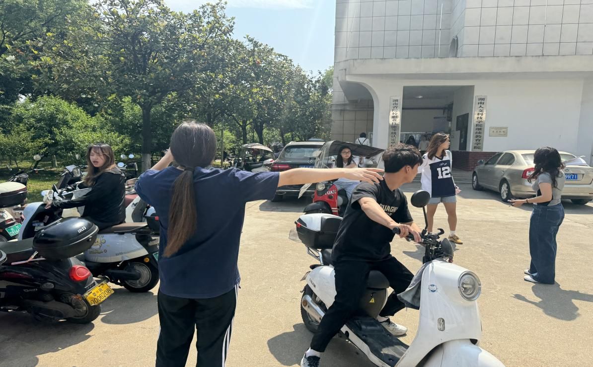 (学生党员在博达楼前坪劝导学生将电动车规范停放、按序排列)