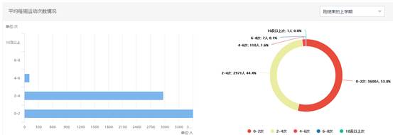 本学期学生平均每周运动4-6次占比约为1.6%(110人);平均每周运动2-4次占比约为44.4%(2941人);平均每周运动0-2次占比约53.8%(3600人)。