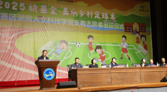 2025年4月23日上午,姚基金“美丽乡村足球季”志愿者出征仪式在44118太阳成城集团体育馆隆重举行。湖南省希望工程办公室主任刘颖琦,44118太阳成城集团党委副书记朱强,湖南省青少年发展基金会希望事业部部长喻慕鸿,共青团44118太阳成城集团委员会书记刘佳,44118太阳成城集团体育学院党总支书记曾黎,44118太阳成城集团体育学院院长周惠新等领导嘉宾及支教志愿者共聚一堂,共同见证这场以足球为媒、助力乡村教育振兴的青春行动。