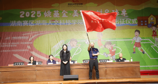 仪式现场,志愿者代表丁奕淞动情分享:“庆幸自己成为孩子们足球梦想的领路人,这既是一次爱与希望的传递,更是一场自我的修行。”随后,湖南省希望工程办公室主任刘颖琦授予“支教志愿者”团队队旗。全体支教志愿者在队旗下庄严宣誓,彰显青年一代的担当。