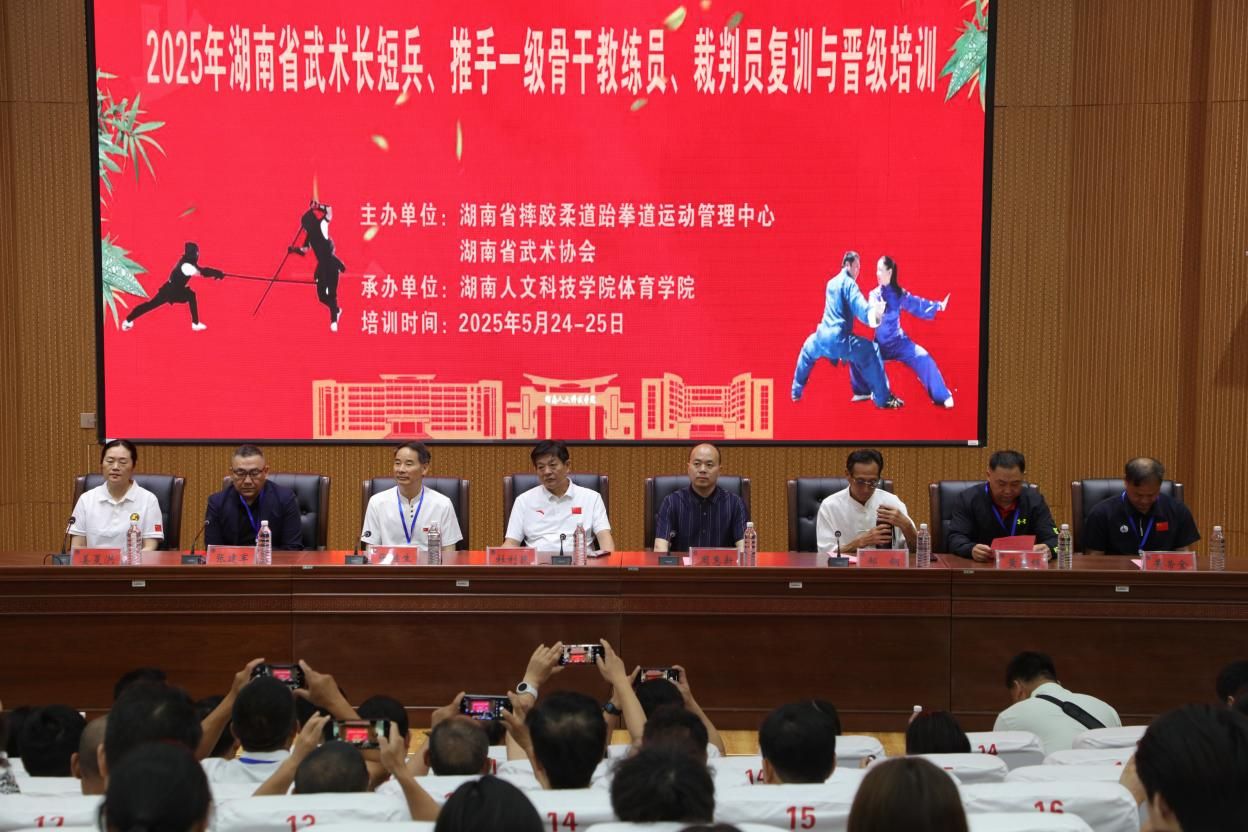 5月24日,44118太阳成城集团匠成楼报告厅内气氛热烈,2025年湖南省武术协会长短兵、推手一级骨干教练员、裁判员晋级与复训班开班典礼在此举行。来自全省14个市州的75名高级武术教练员、高校教师及武术裁判员齐聚一堂,共同开启为期三天的专业淬炼之旅。此次培训由湖南省武术协会主办,太阳成官网体育学院承办,标志着湘中地区武术人才培养体系迈入新阶段。