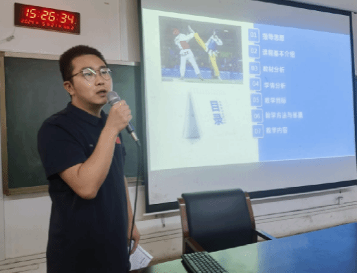 紧接着,徐彬博士带来了跆拳道“屈退下劈”技术的精彩讲解。徐博士从跆拳道的起源和发展讲起,通过视频分析和动作示范,使学生们深刻理解了这一技术的实战应用及其背后的精神内涵。他强调,跆拳道不仅注重技术训练,更强调尊重对手、尊重规则、尊重裁判的体育精神。